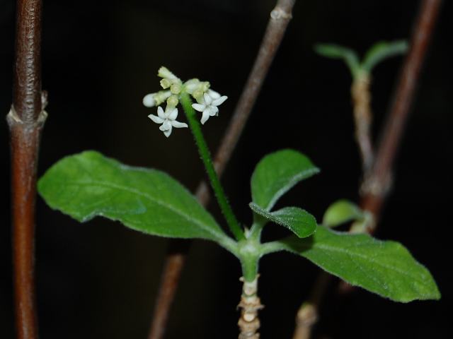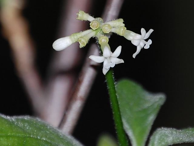 枝先に集散花序(茎先に花がつき、少し下から横枝が出てその先にも花がつく)を出し、白い小さな花をつける。