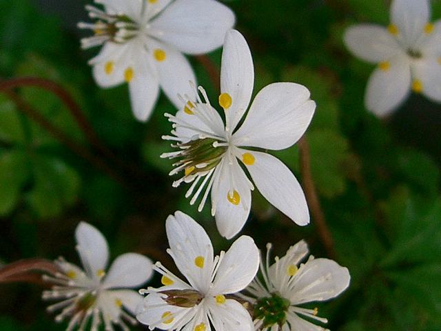 5~10センチの花茎を伸ばし、花径1センチくらいの梅に似た白い五弁花を咲かせる。