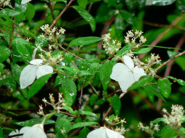 葉の脇から集散花序(最初の花が枝先につき、その下に次々と側枝を出して花がつく)を出し、花径10~15ミリくらいの白い5弁花を下向きにつける。