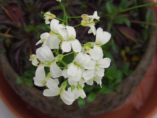 茎先総状花序(柄のある花が花茎に均等につく)を出し、白い小さな4弁花をつける。
