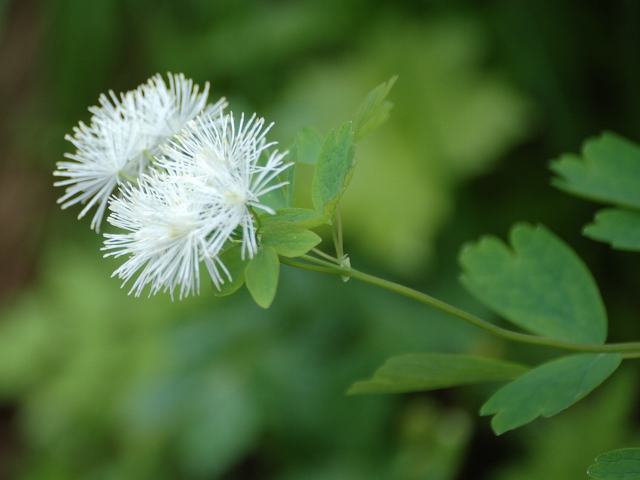 葉は3-4回3出複葉といって、3出複葉(1つの葉が3枚の小さな葉に分かれた形)の1枚1枚の小葉が更に3枚の小葉に分かれ、それをもう1-2回繰り返す。