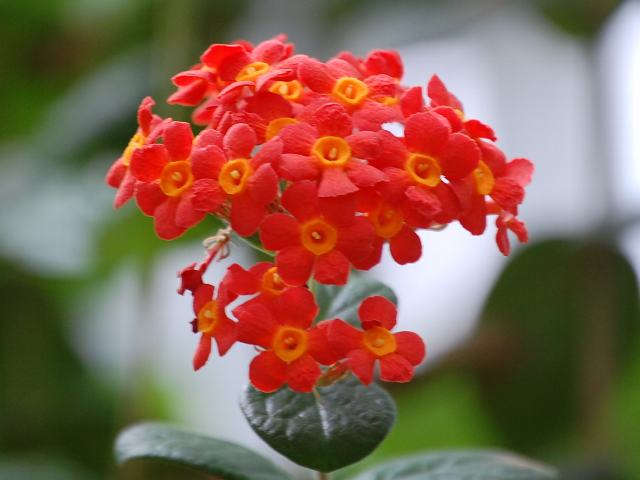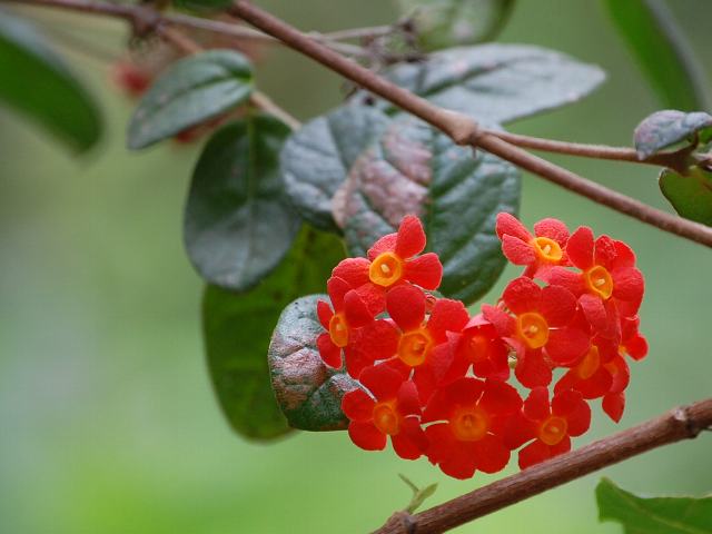 枝先に集散花序(最初の花が枝先につき、その下に次々と側枝を出して花がつく)を出し、香りのよい赤橙色の花を咲かせる。