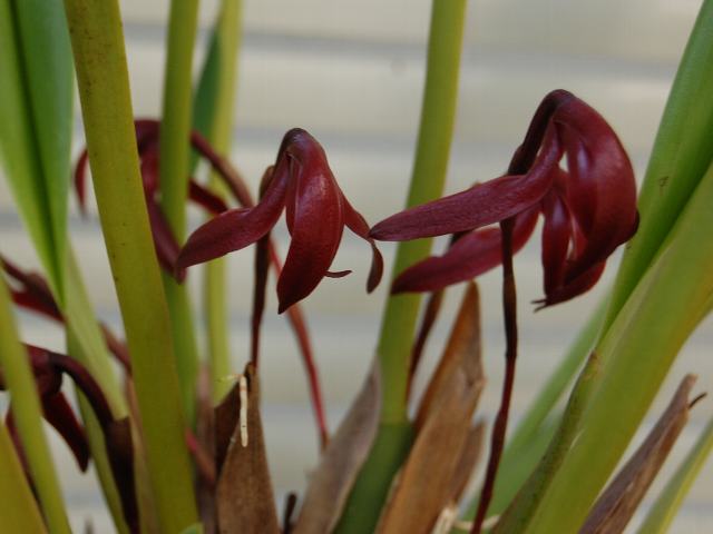 茎先に暗い紅色をした鉤爪のような花を咲かせる。