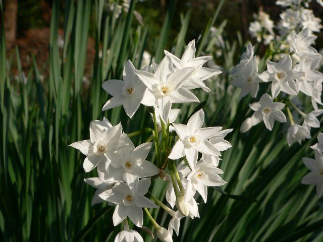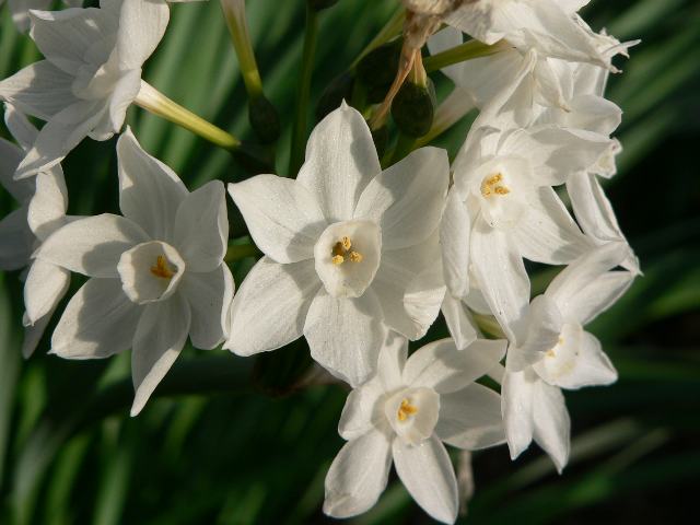 日本水仙(ニホンズイセン:Narcissus tazetta ver.chinensis)は房咲き水仙(Narcissus tazetta)の仲間で、1本の茎にいくつもの花をつける。