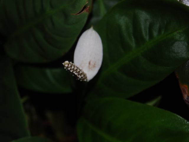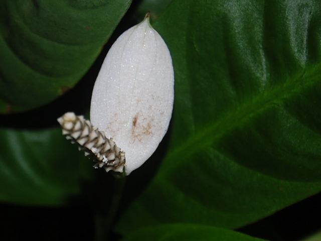 その間から白っぽい肉穂花序(花軸が多肉化して花が表面に密生したもの)を出す。