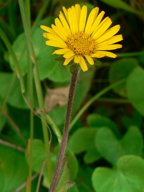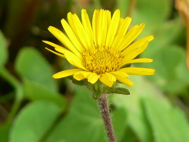 茎先に花径3~4センチの黄色い花(頭花)を1つ上向きにつける。