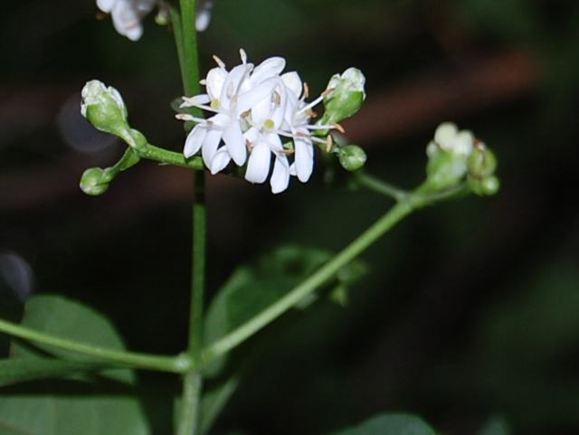 枝先や上部の葉の脇から長い柄のある集散花序(最初の花が枝先につき、その下に次々と側枝を出して花がつく)を出し、白い花をつける。