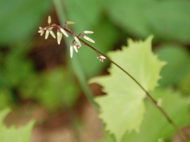 三角形の小さな白い花を咲かせる。