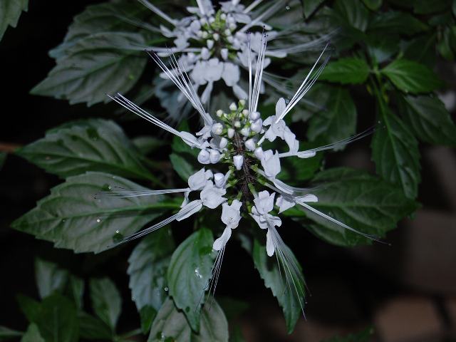 茎の上部に穂状花序(柄のない花が花茎に均等につく)を出し、白い花をブラシ状に細長くつける。