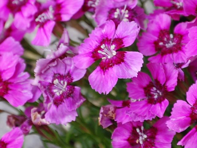 花は紅紫色をした5弁花で、真ん中が白っぽく、その周りに暗い赤色の輪が入る。