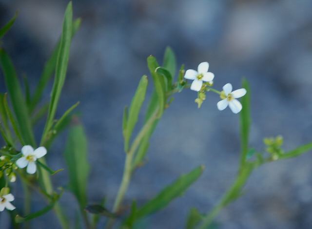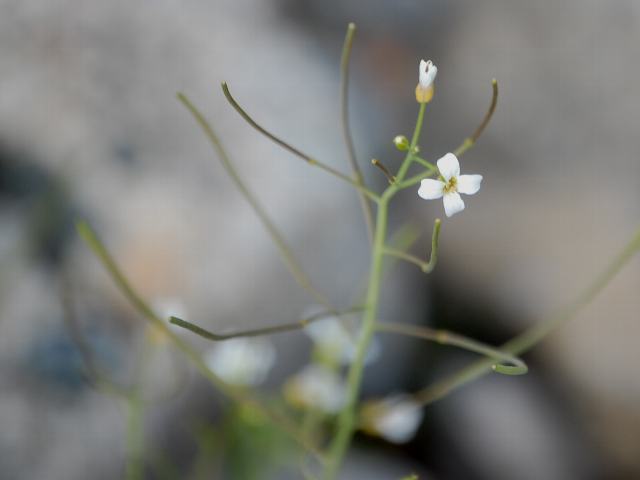 茎先に疎らな総状花序(柄のある花が花茎に均等につく)を出し、白い小さな十字状の花をつける。