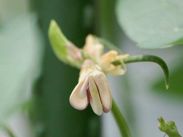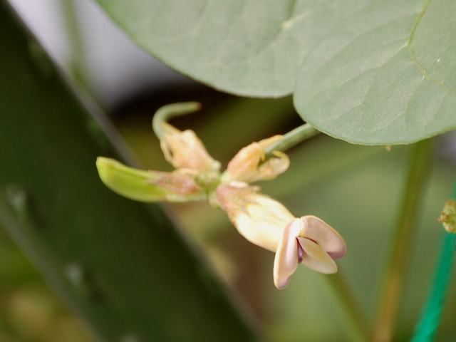 葉の脇に淡い紅色を帯びた白い蝶形の花をつける。