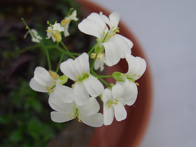 茎先総状花序(柄のある花が花茎に均等につく)を出し、白い小さな4弁花をつける。