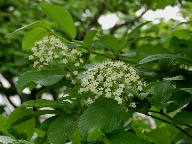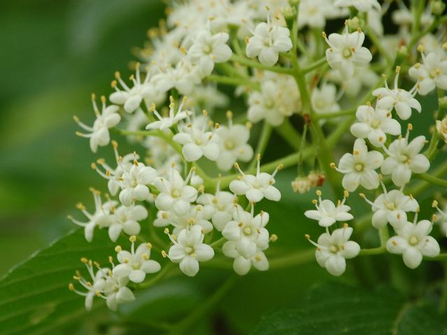 枝先から小さめの散房花序(柄のある花がたくさんつき、下部の花ほど柄が長いので花序の上部がほぼ平らになる)を出し、花径5~10ミリくらいの小さな白い花を数個つける。