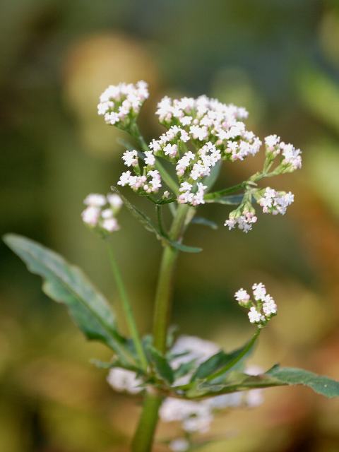 茎先に散房花序(柄のある花がたくさんつき、下部の花ほど柄が長いので花序の上部がほぼ平らになる)を出し、花径2~3ミリの白い小さな花をたくさんつける。