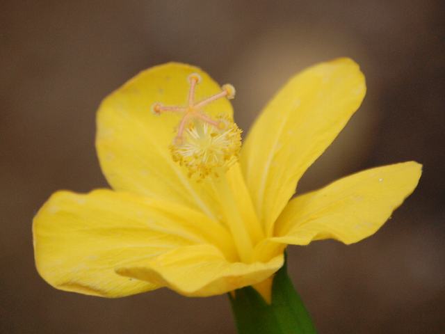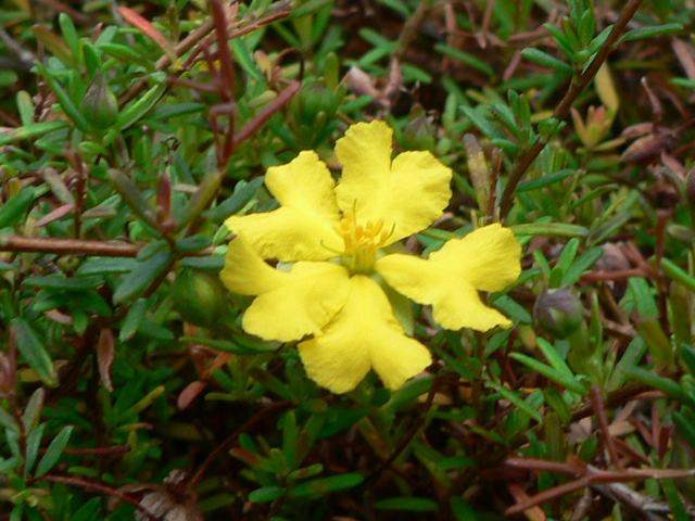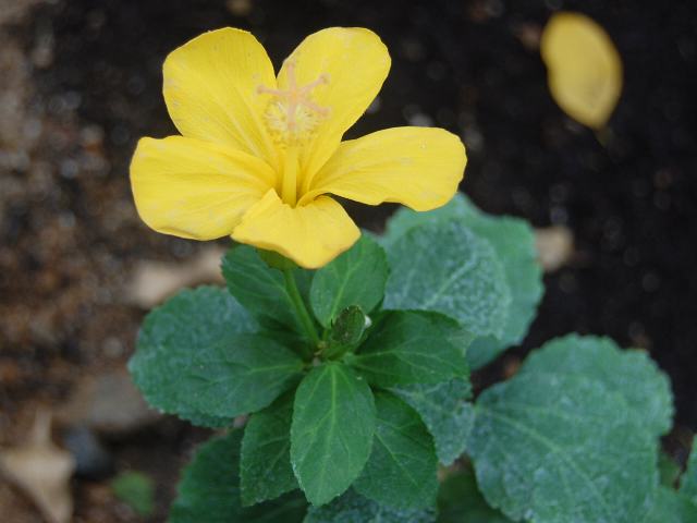 葉の上まで花茎を伸ばし、花径12ミリくらいの小さな黄色い5弁花をつける。