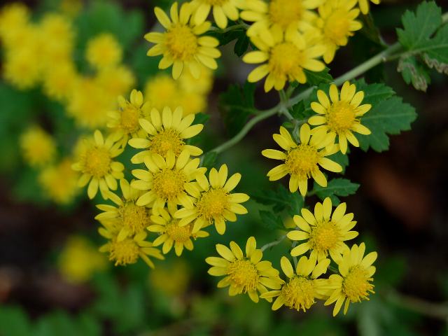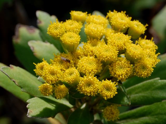 頭花は舌状花も筒状花も黄色で、ひしめき合うように密につく。