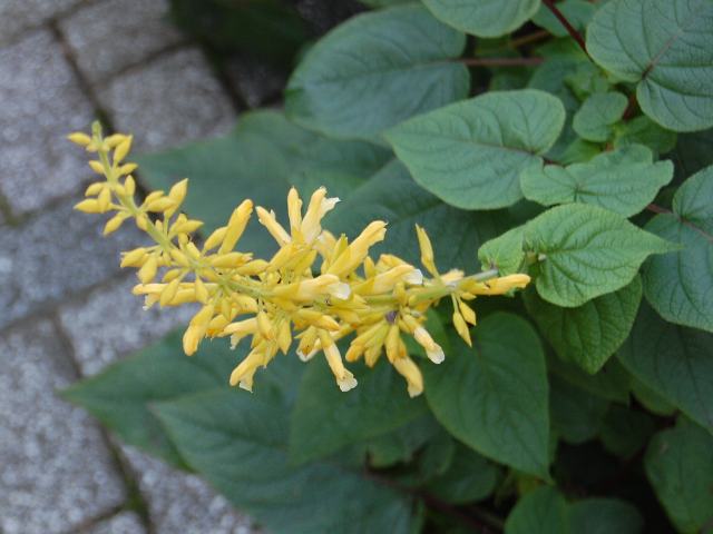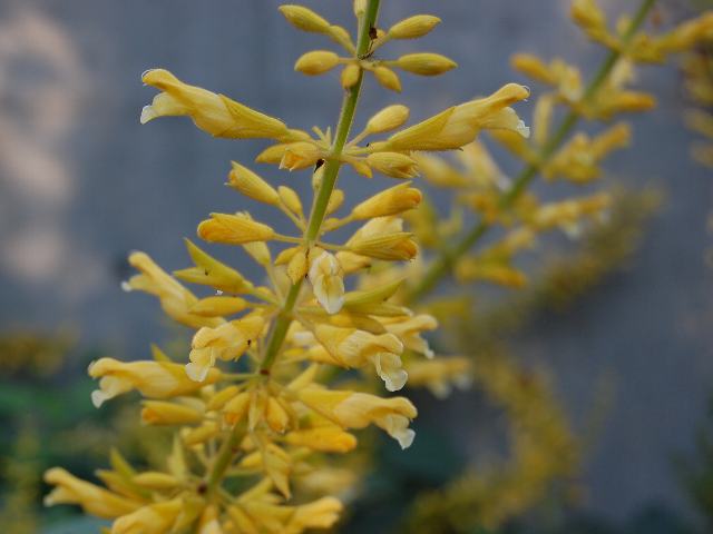茎先に長い穂状花序(柄のない花が花茎に均等につく)を出し、黄色い唇形の花をつける。