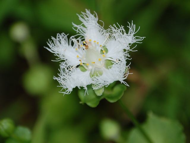 花茎を立て、茎先に縁が糸状に細かく裂けた白い5弁花を1輪開く。