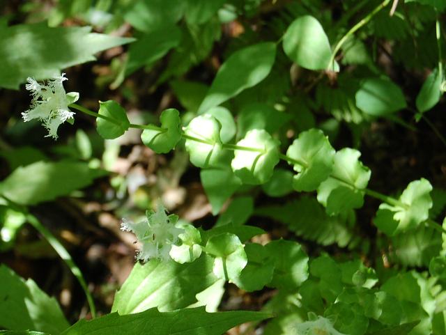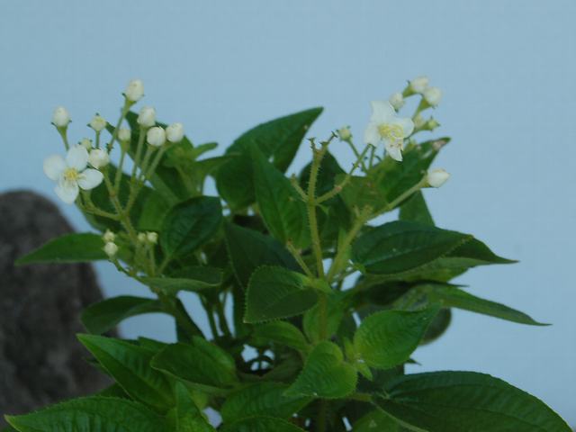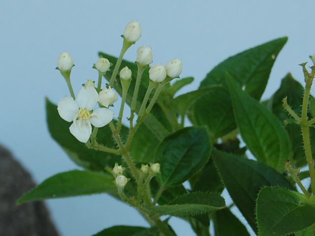 葉の脇から花柄を出し、白いの花を数輪ずつつける。