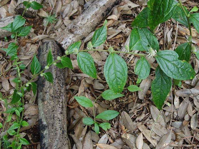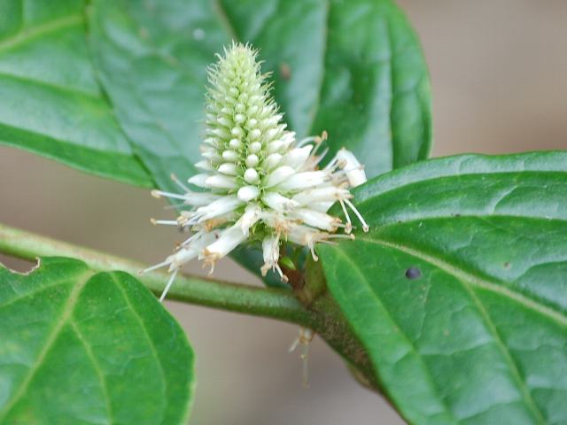 葉の脇から円柱状の花序を出し、白い花をたくさんつける。