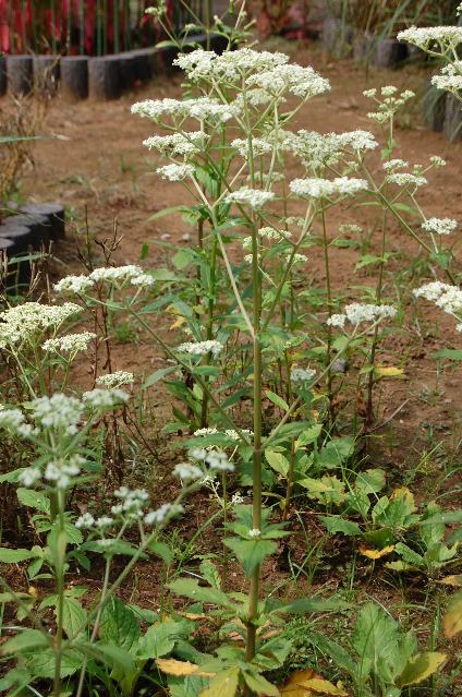 茎の上部で枝分かれをして、散房花序(柄のある花がたくさんつき、下部の花ほど柄が長いので花序の上部がほぼ平らになる)を出し、白い小花をたくさんつける。