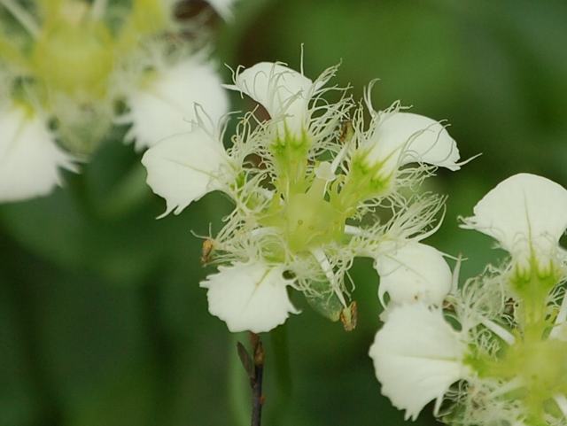 雄花には白い3枚の花弁と多数の雄しべがある。