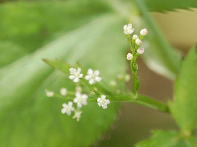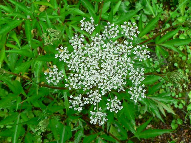 茎先に複散形花序を出し、白い小さな花をたくさんつける。