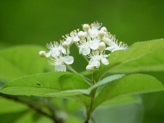 枝先に散房花序(柄のある花がたくさんつき、下部の花ほど柄が長いので花序の上部がほぼ平らになる)を出し、花径1センチくらいの白い5弁花をたくさんつける。