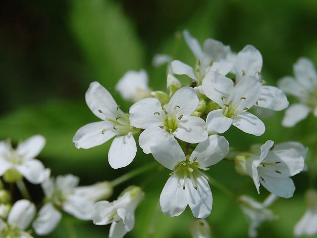 茎先に花径6ミリから8ミリの小さな白い4弁花を密生させる。
