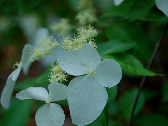 枝先に散房花序(柄のある花がたくさんつき、下部の花ほど柄が長いので花序の上部がほぼ平らになる)を出し、周りには3枚から5枚の萼片をもつ白い装飾花、中央には淡い黄緑色の小さい両性花をたくさんつける。