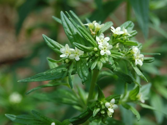 茎先に小さな白い五弁花をつける。