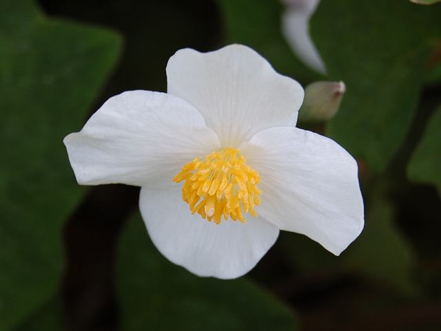 直立する1本の花柄の先に花径5センチから7センチくらいの白い花を横向きにつける。