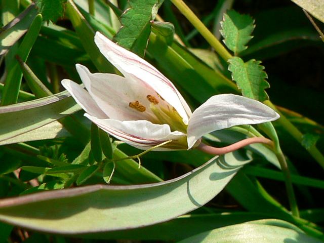 花の色は白く、花びらの外側に赤紫色の筋がある。
