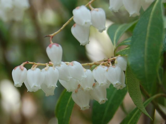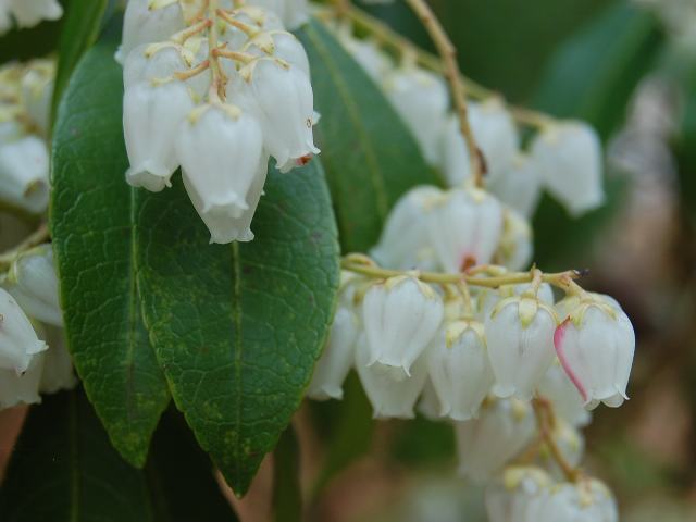 濃緑色の葉が茂る枝先に壺形の白い小花を総状にたくさんつける。
