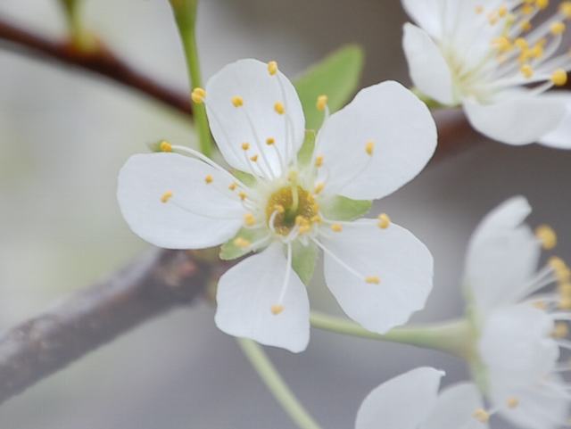 李(スモモ)と同じような白い5弁花で、長くて黄色い雄しべがたくさんある。