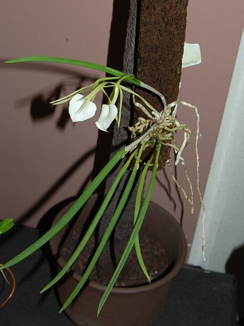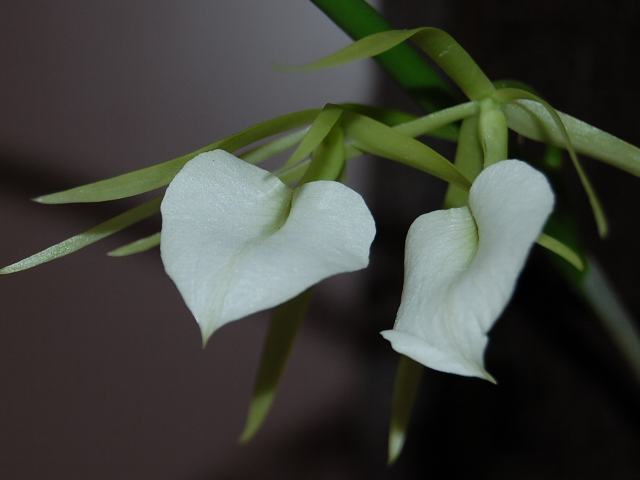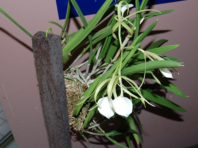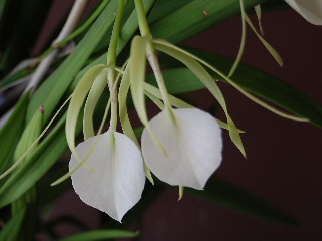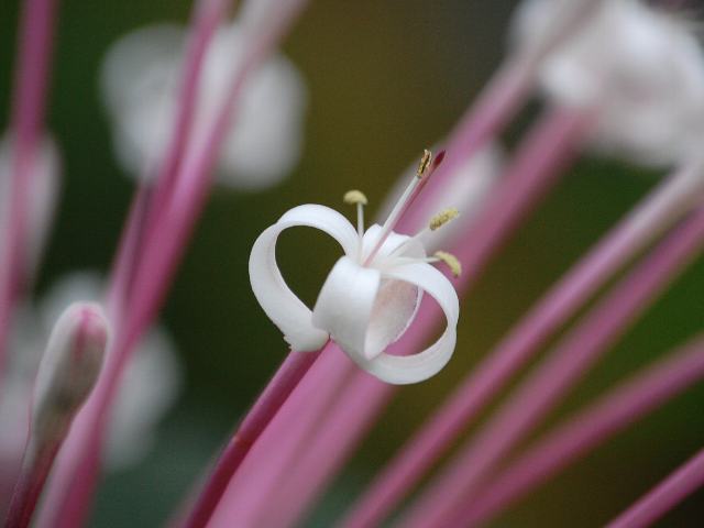 長い花筒は淡い紅紫色で、白い花冠は先で5つに裂ける。