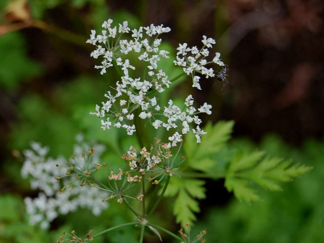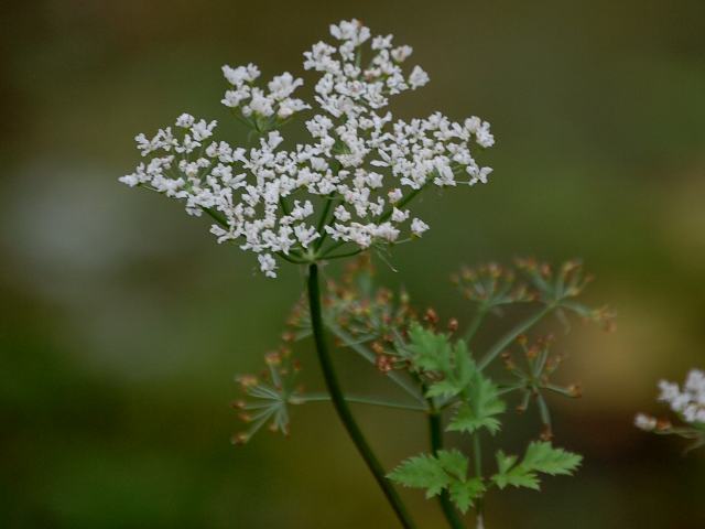 茎先に複数の散形花序(枝先に1個つずつ花がつく)を出し、白い小さな花をたくさんつける。