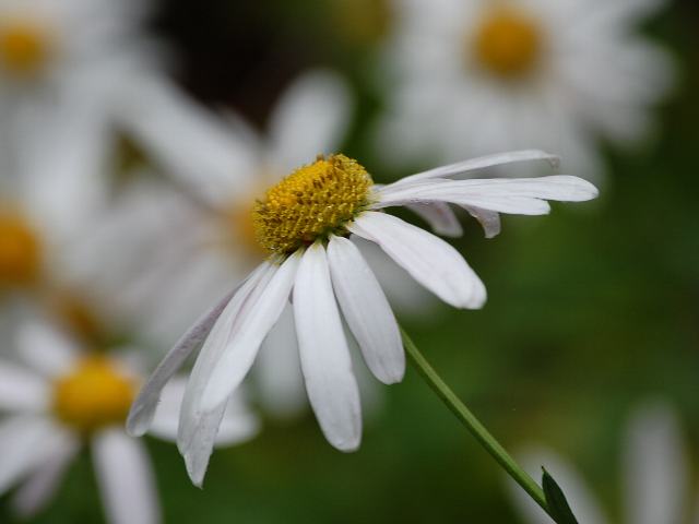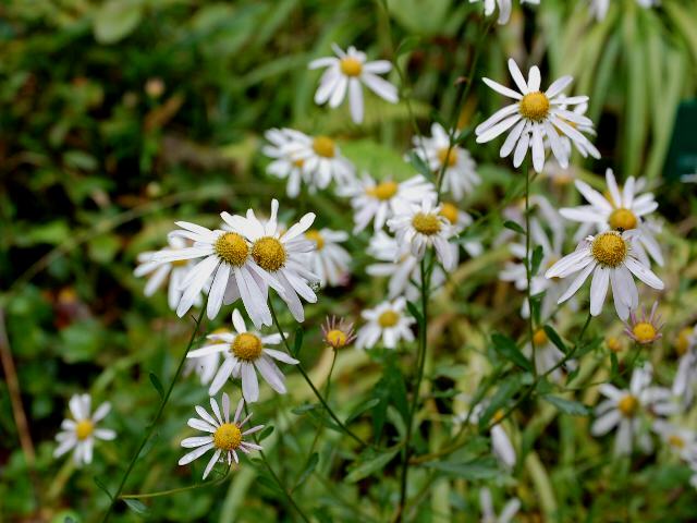 花の真ん中は黄色い筒状花で、周りに白い舌状花が並ぶ。