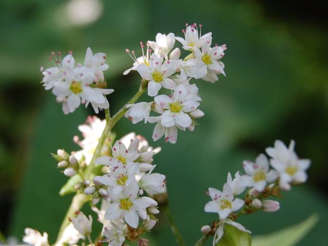 茎の上部の葉の脇から花柄を出して2つから3つに枝分かれをし、蕎麦(ソバ)に似た白い小花を数個つける。