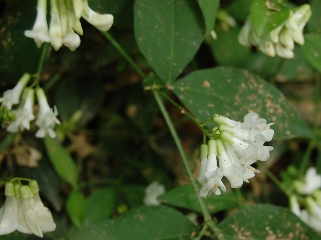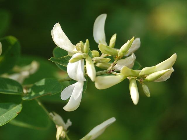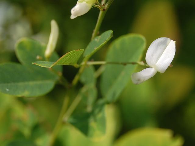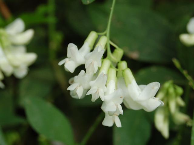 葉の脇に総状花序(柄のある花が花茎に均等につく)を出し、細長い蝶形をした白い花をたくさんつける。