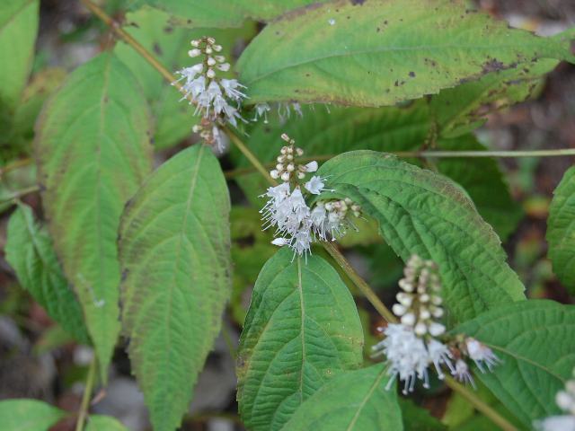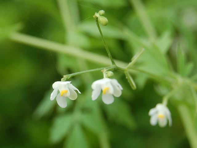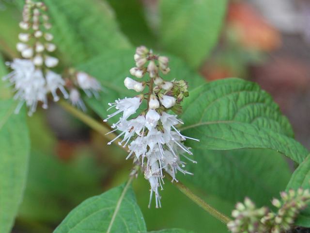 上部の葉の脇に総状花序(柄のある花が花茎に均等につく)を出し、片側だけに白い唇形の花を並べてつける。