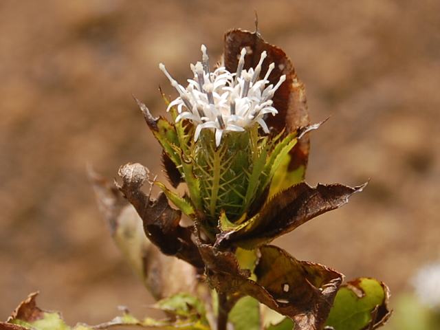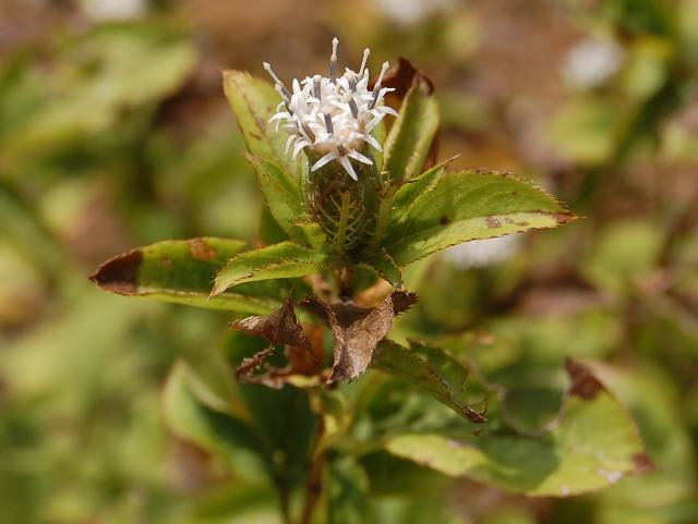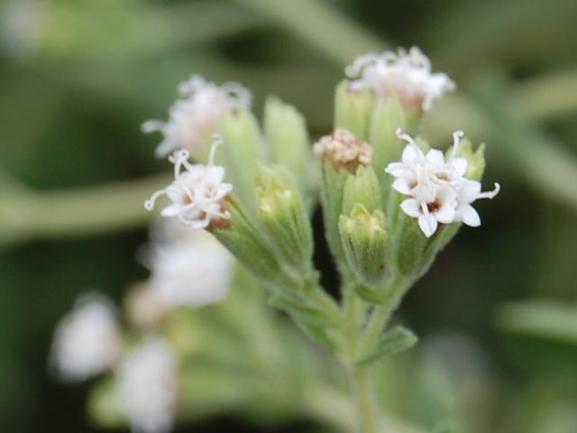 小さく白い花(頭花)が群がって咲く。