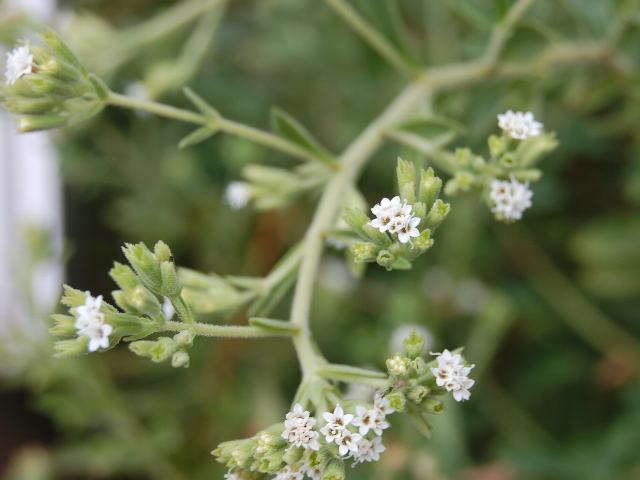 葉の脇から散房花序(柄のある花がたくさんつき、下部の花ほど柄が長いので花序の上部がほぼ平らになる)を出し、白い小さな花をつける。