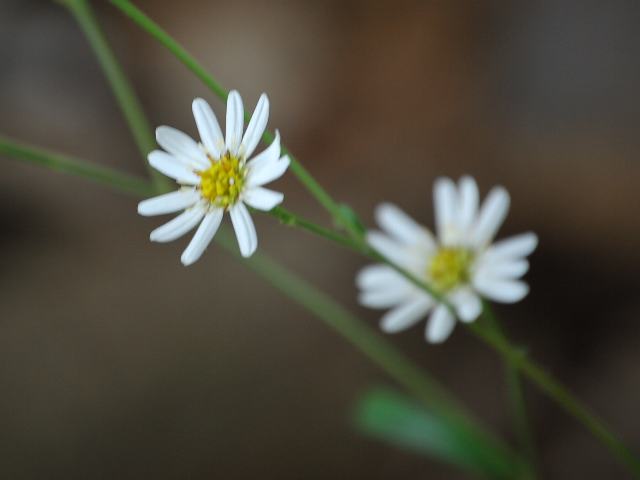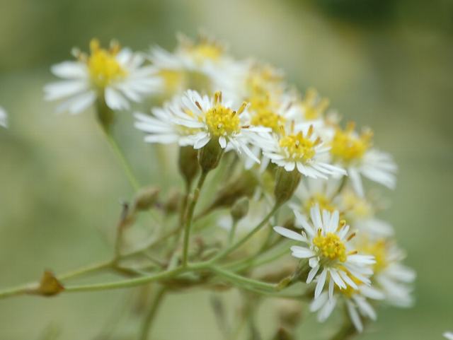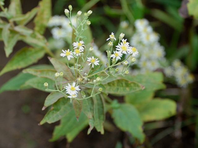 茎先で細かく枝分かれをし、先に花径15ミリくらいの白い花(頭花)をつける。
