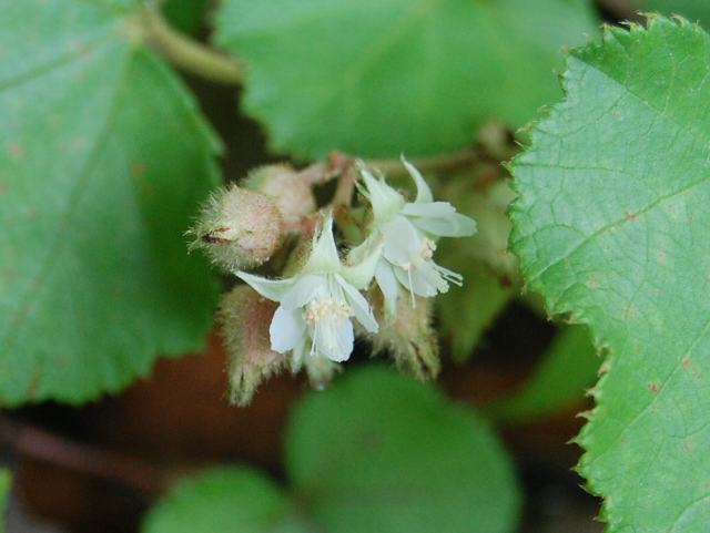 枝先や葉の脇に花径1センチくらいの白い花を数輪つける。