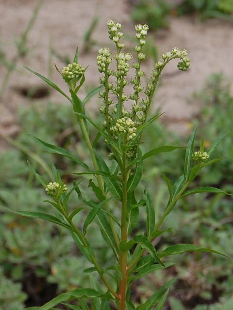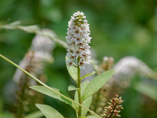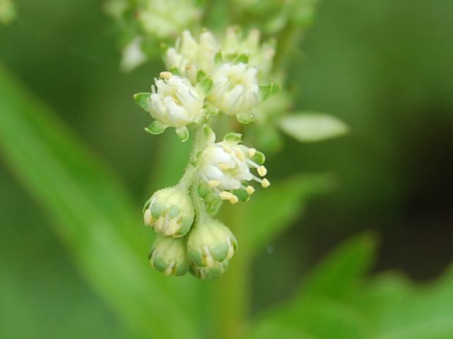 茎先に穂状の細長い花序を出し、白い小さな花をたくさんつける。