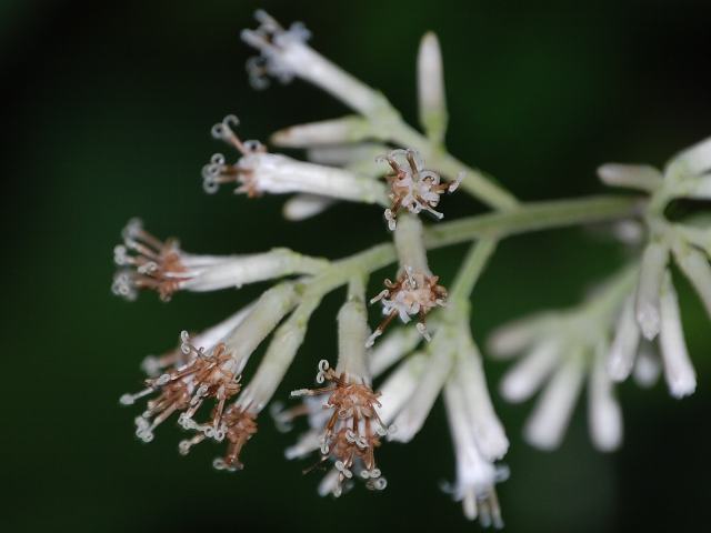 茎先に細い円錐花序を出し、白い花(頭花)をつける。