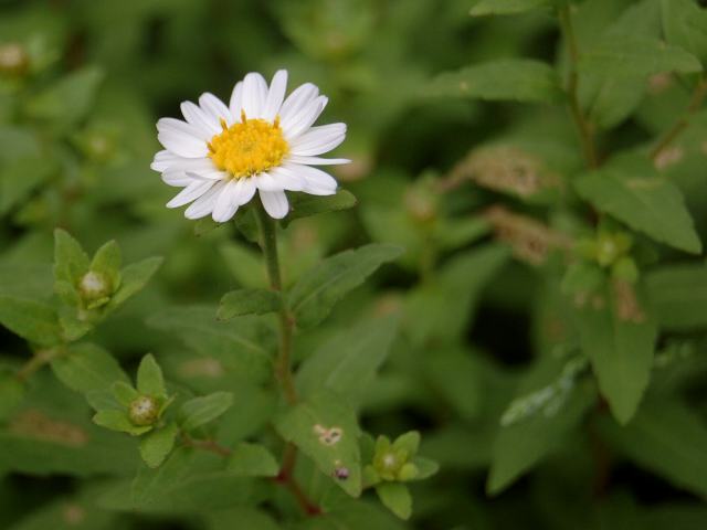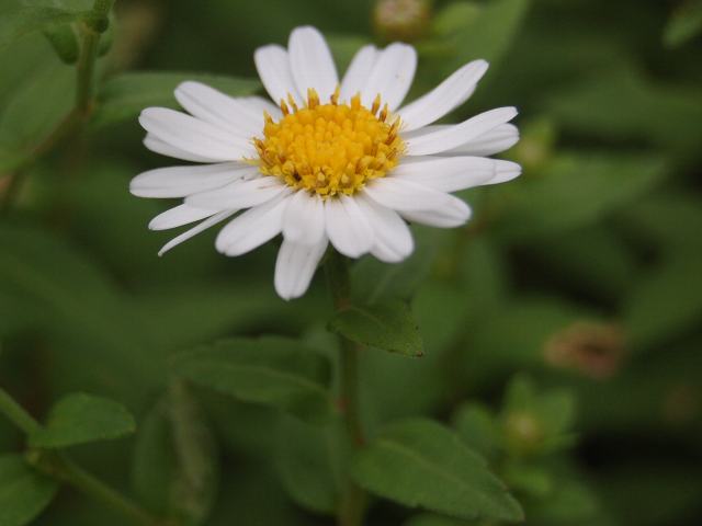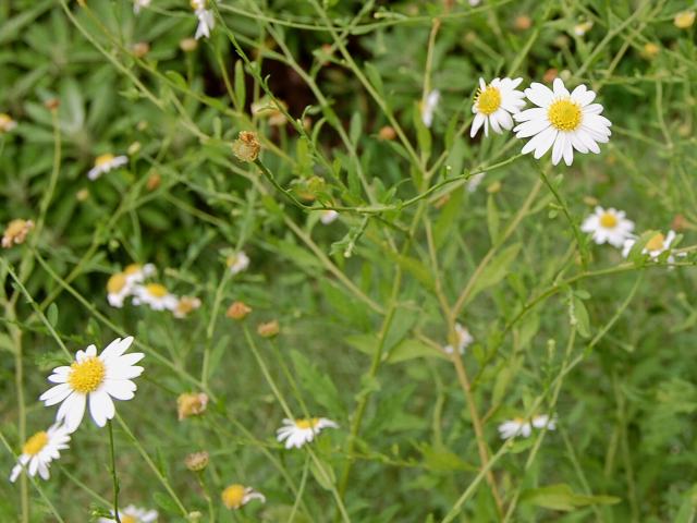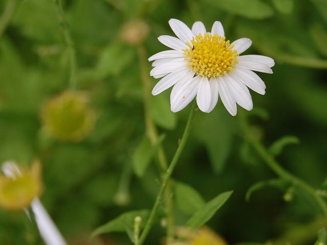 マーガレットを小形にしたような花径2~3センチの花(頭花)を茎先につける。
