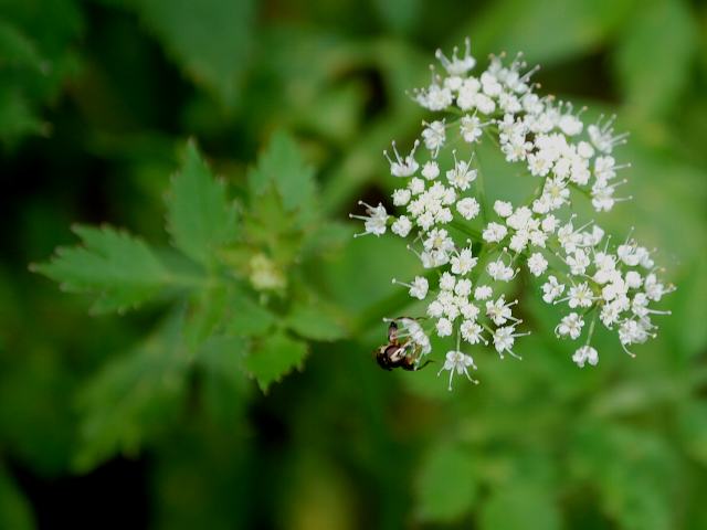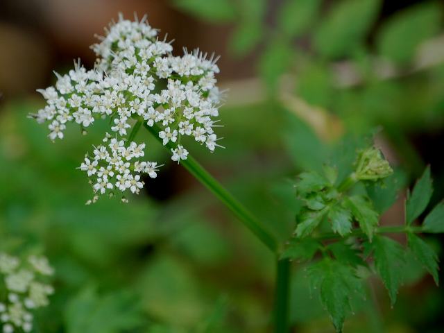 茎先に複散形花序を1個出し、花径5~6ミリの白い小さな花をたくさんつける。